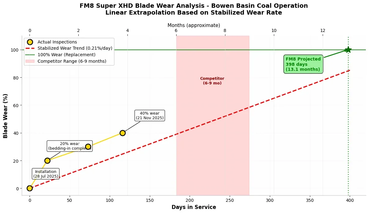 For operations in the Bowen Basin and similar high-abrasion coal environments, FM8 Super XHD blades deliver quantifiable value: